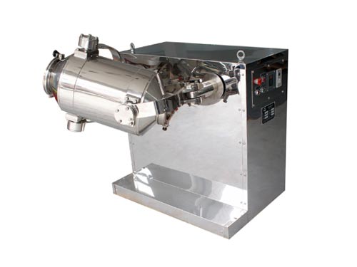 該機(jī)工作時(shí),混料器具有三維運(yùn)動(dòng),在進(jìn)行自轉(zhuǎn)的同時(shí)進(jìn)行公轉(zhuǎn),混料器一方面具有強(qiáng)烈的湍動(dòng)作用,加速了物料的流動(dòng)和擴(kuò)散,另一方面有翻轉(zhuǎn)和平移運(yùn)動(dòng),克服了離心力的影響,使物料不會(huì)產(chǎn)生比重偏析和集聚現(xiàn)象,也無死角,保證混合均勻。